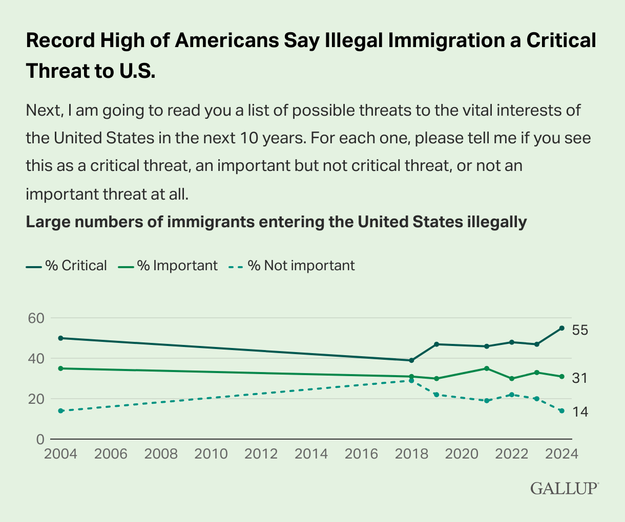 immigration is perceived as a threat | according to gallup, “a record-high 55% of U.S. adults, up eight points from last year, are saying ‘large numbers of immigrants entering the United States illegally’ is a critical threat to U.S. vital interests. The prior high was 50% in 2004.”