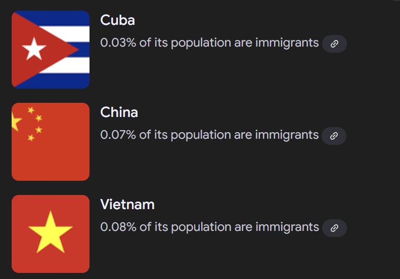 north korea isn’t far behind at 0.19%—what the three countries above have in common is that they’re all run by strict communist regimes (with authoritarian tendencies). given the rhetoric in nations like the united states, one would think “socialist” nations would be particularly welcoming to immigrants, given their over-emphasis on so-called “equality”. but this is not—and never has been—the case. the anti-immigrant link to communism and authoritarianism is born out in research tracing back to east and west germany:
